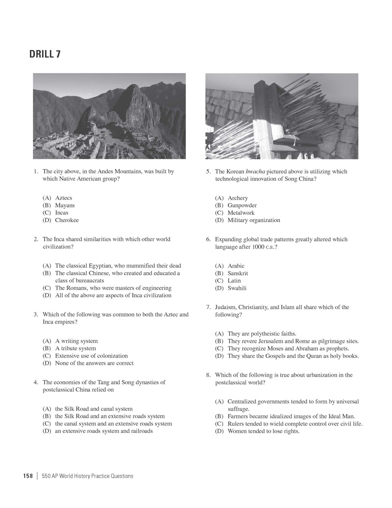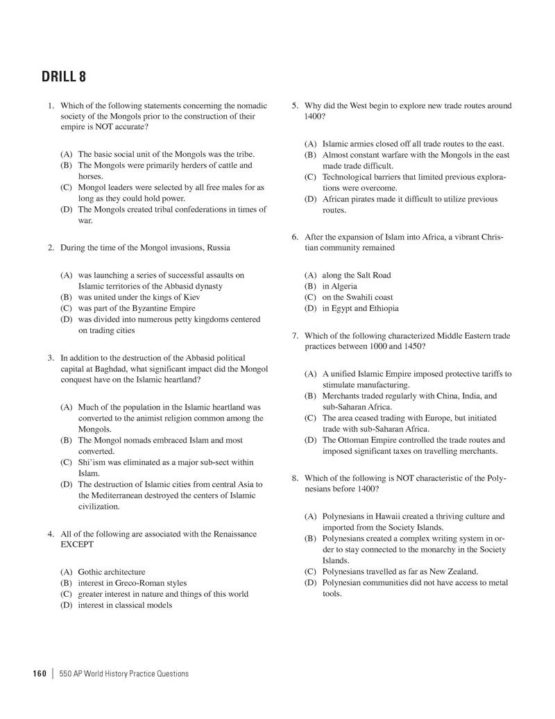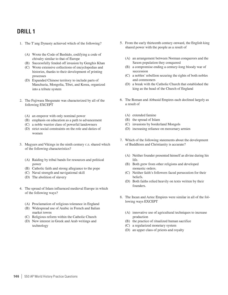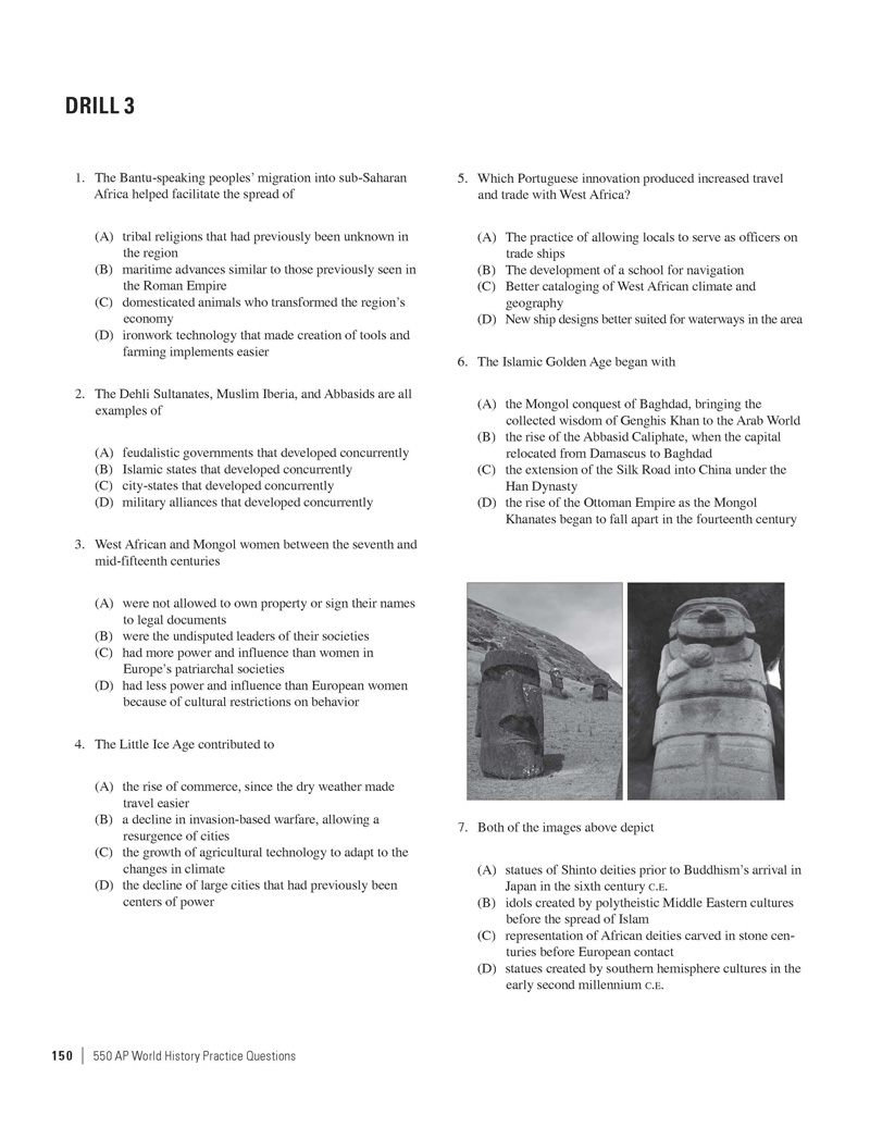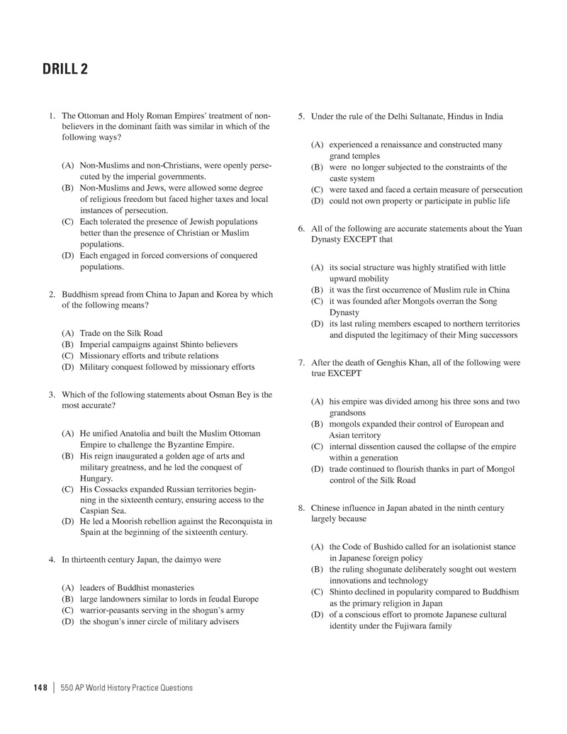 Excerpted from 550 AP World History Practice Questions by the Staff of The Princeton Review. Copyright © 2014 by The Princeton Review, Inc. Excerpted by permission of The Princeton Review imprint of the Random House Children's Group, a division of Random House LLC. All rights reserved. No part of this excerpt may be reproduced or reprinted without permission in writing from the publisher.